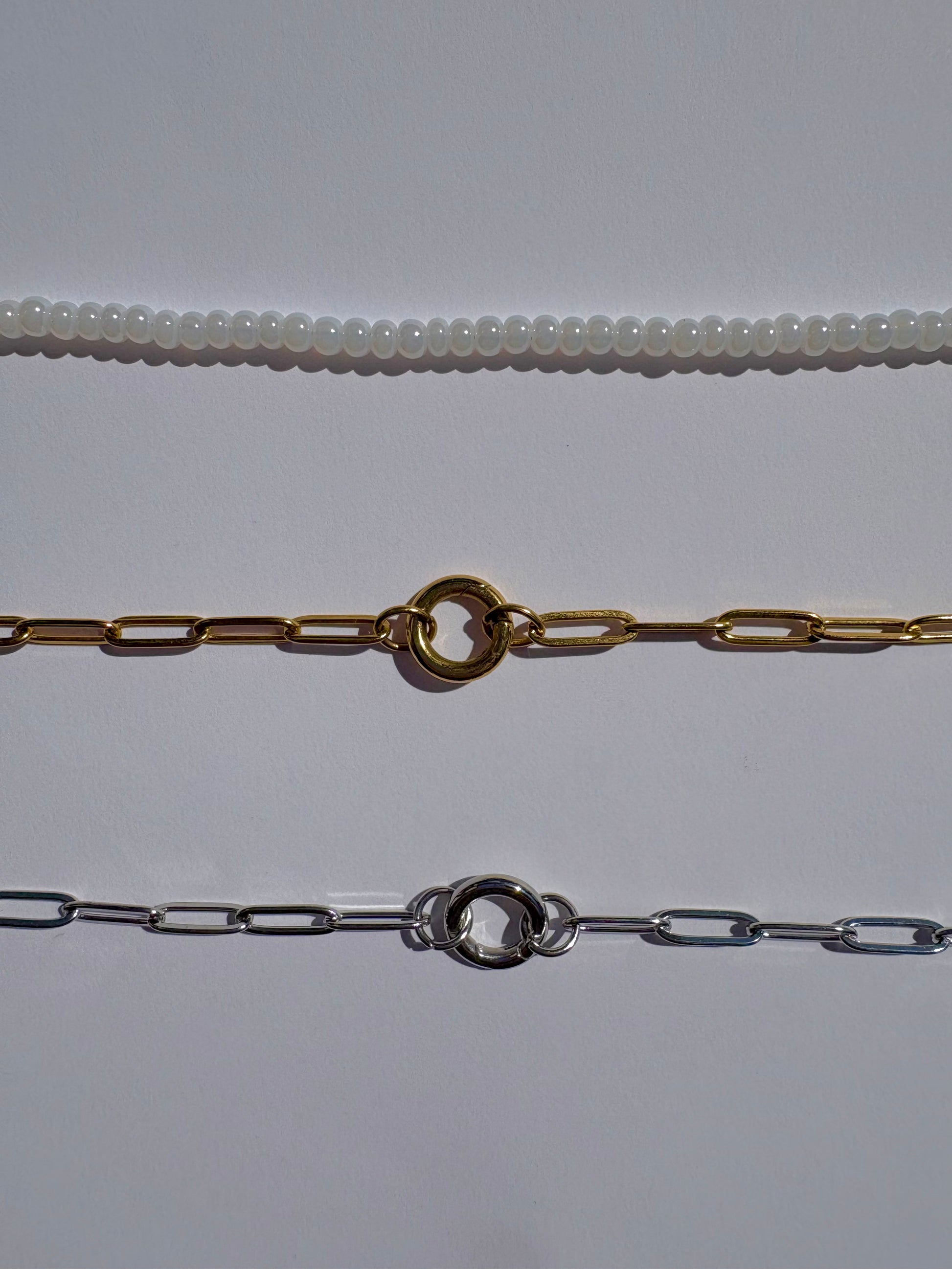 Our beaded chains are crafted with high quality, iridescent white glass beads and take an additional 30 minutes to complete. Perfect for layering or as lovely a standalone piece.